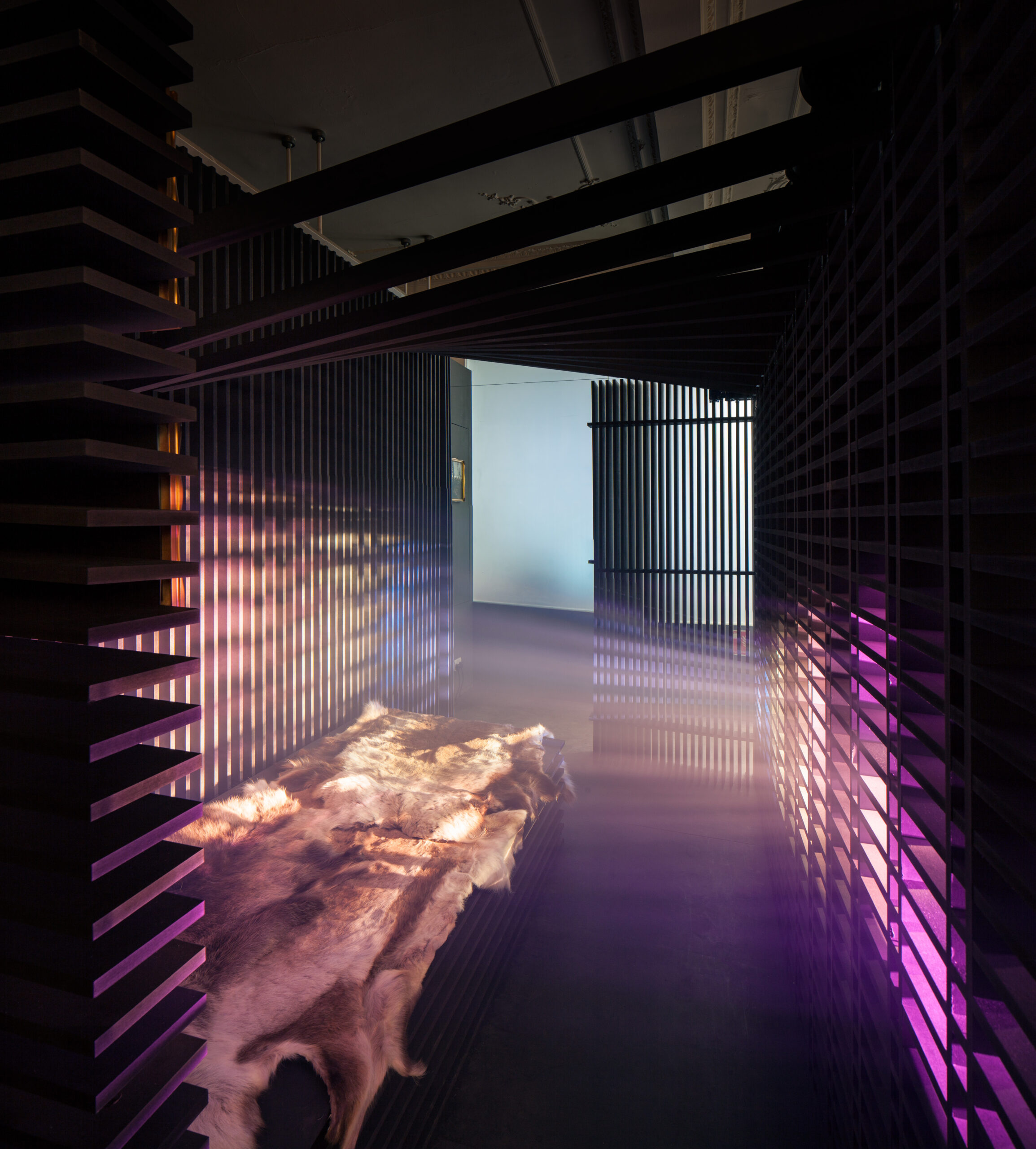 Light Touch is a kinetic-light installation conceived in collaboration with Haptic Architects, where I engineered a wave mechanism to animate a constellation of CNC-milled black MDF slats, producing a slow, breathing choreography of light. Over the eight-week run in the temporary lobby, the installation gradually transformed the spatial atmosphere: smoke emitted from floor-level vents diffused through the slats, clouding and softening the incoming beams of illumination. The movement of light through the shifting planes evoked a resonant dialogue with the subtle seasonal light qualities of Nordic landscapes. In this project I built the central kinetic driver; my student Chryssa Varna assisted in both the design detailing and production. The result was not just a spectacle of light, but a sensitive architecture of motion—one in which light, shadow, and ambient atmosphere become an inhabitable performance in time.