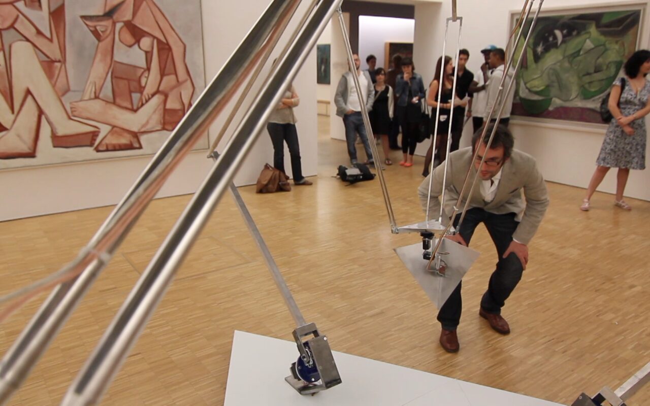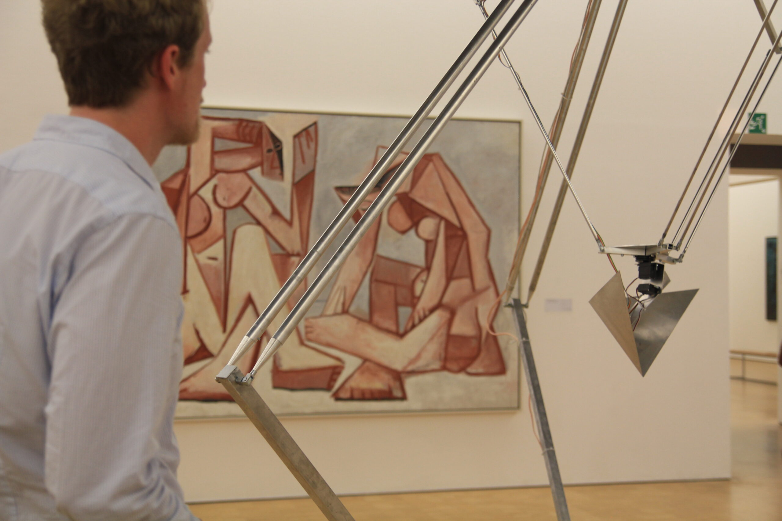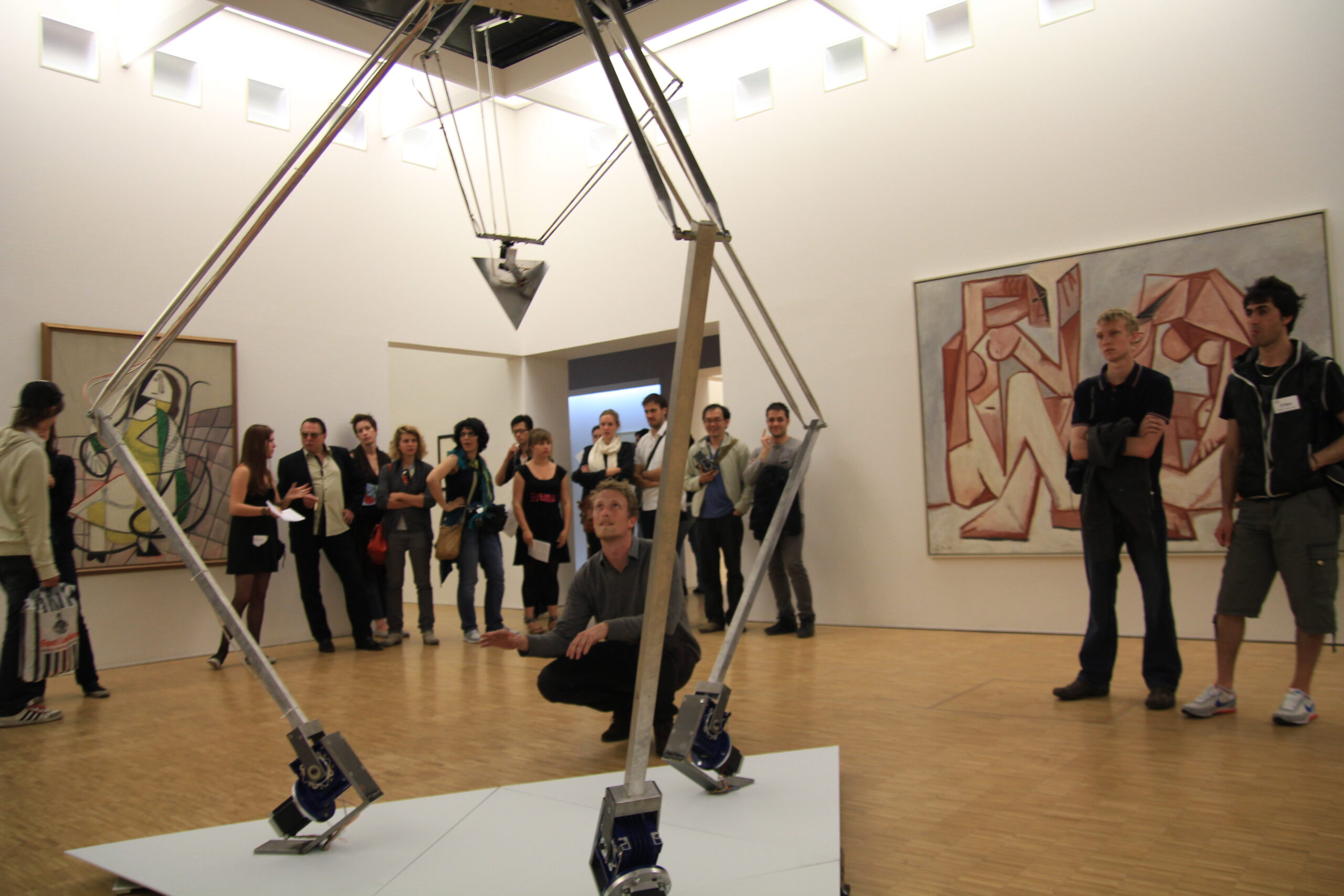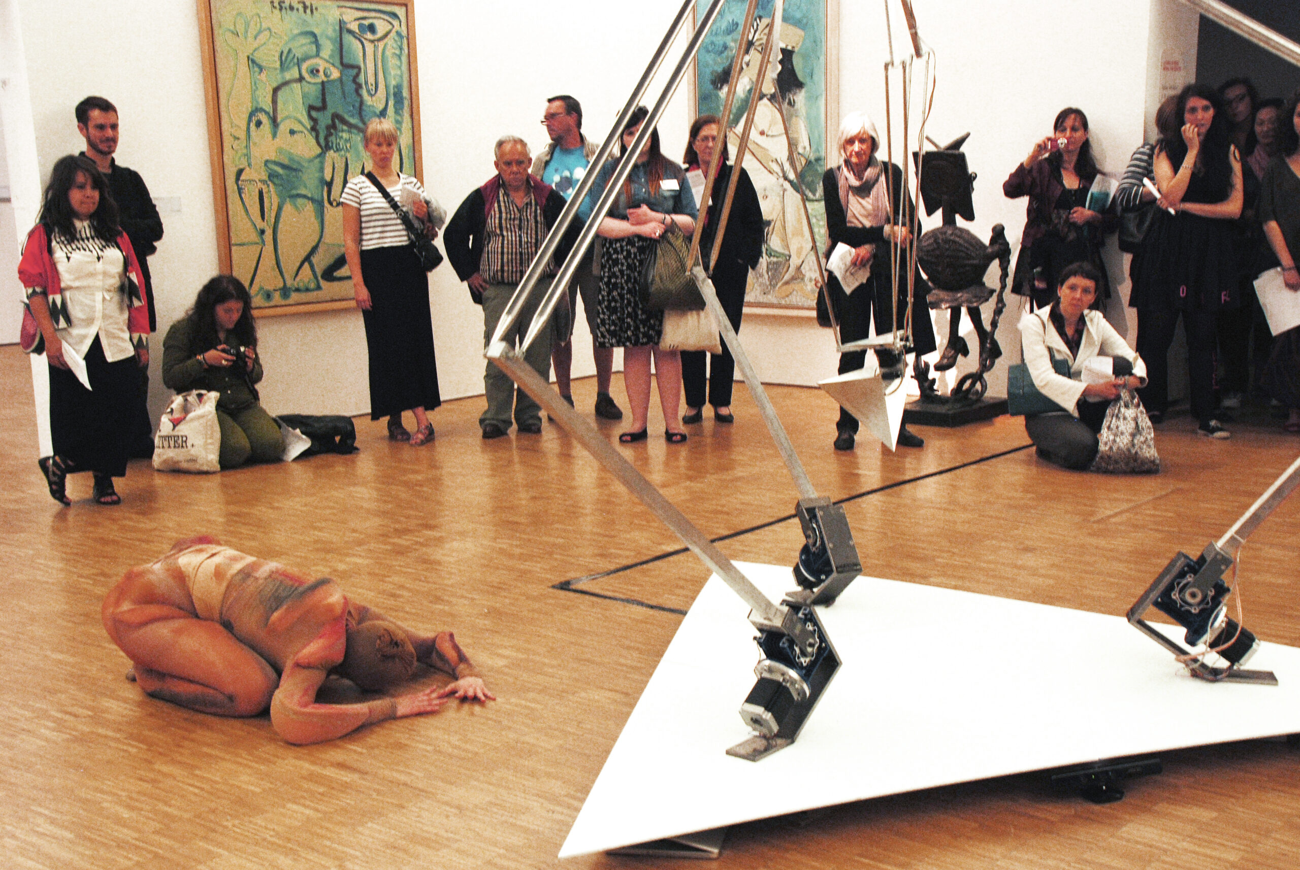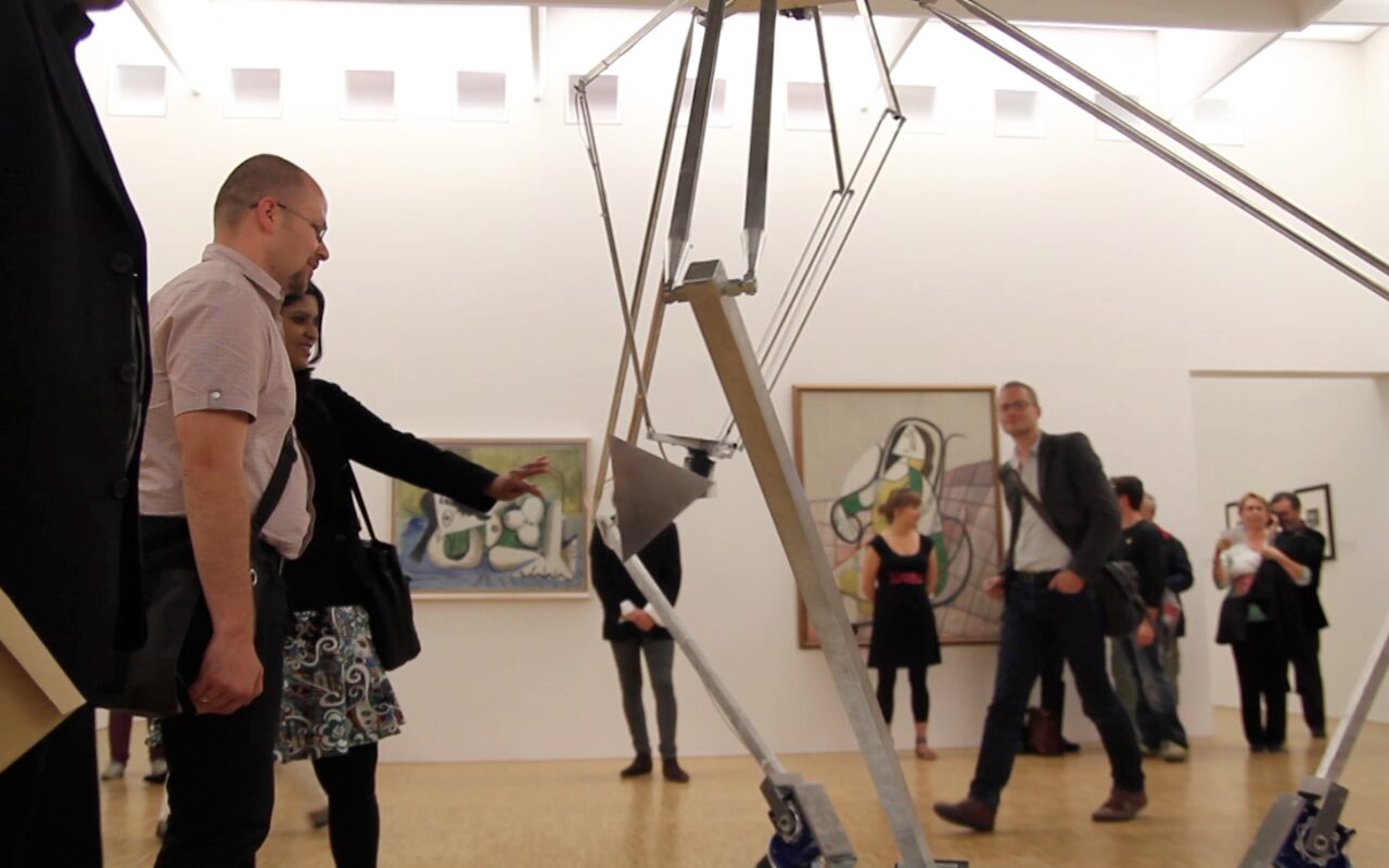 An interactive installation and performance, developed through a collaboration between interaction designers, architects and performance artists. Its principal performer, a 3 metre high responsive robot, interacts with its audience’s gestures while it waits for the arrival of its human co-performers. The film shown here presents the first choreographed site specific work to come from this colloquy. Titled ‘The Promise of Touch’, it was presented at the Pompidou Centre in Paris in June 2011. responding to two works within the Gallery – Francis Bacon’s Triptych ‘Three Figures in a Room’ (1964) & Pablo Picasso’s ‘Femmes devant la mer’ (1956).